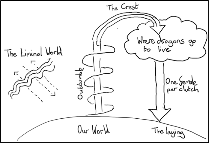 Hugh theorised (on what I believe to be woefully inadequate data) that the laying dragons come back from wherever it is that the outtumble took them as dragonlets but that they go on to somewhere else. He suggests that some of the dragonlets don’t survive the outtumble and that a further group die either from starvation or their wounds as the dragon population fight for scarce resources. Of those that remain, just one returns to lay eggs in our world and in that moment their path is sundered from their kind – there are simply not enough sheep to fuel the full outtumble of an adult dragon and so once the eggs are laid, the dragon slips into an intermediate place, out of this world but not in the next.