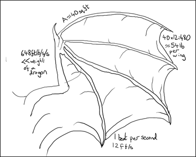 The next section of Hugh’s book is a confusion of sketches and calculations as he wrestles with the problem of dragon flight, both the force needed to propel them upwards and the energy they would have to consume to fuel a day in the air. Since even young dragons are larger (and far heavier) than the largest birds, this is a reasonable concern, even if Hugh’s mathematical analysis is lacking in places. The conclusion is that dragons draw energy from the magical background of the place in which they are born (a theory that suggests that the prime numbers that appear in the cycle-lengths of dragon populations could be an evolutionary advantage that makes two coincident hatchings less likely). Hugh suggests that the villages the dragons choose are places with high background magic, although it’s just as possible that the dragons pull magic from somewhere else and have created these hot-spots themselves.