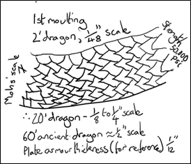 Those stories invariably recount an extended battle (often spun out with choruses of “Fa la lanky down dilly” and the like) that results in victory for the heroic knight and the death or departure of the dragon. Hugh was very suspicious of these tales and filled pages with calculations of arm strength and sword length that would be required to break through the scales of even a modestly sized dragon based on scaling up from smaller creatures (as well as the scales of the dragonlets’ first moulting, he calculated based on what was known of snakes and crocodilians all of which parallels are clearly of dubious worth.) Hugh therefore sought to reconcile his calculations with both the legends and the undoubted fact that the country has not been overrun by dragon populations.